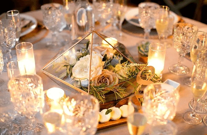 Geometric shapes are a huge trend in 2023, and what better way to incorporate them into your event than with a stunning centerpiece? Whether you opt for a series of small, geometric candle holders or a large, modern vase filled with geometric shapes, this trend is sure to make your guests take notice. The geometric shapes can be made out of anything, including acrylic, glass, metal or even paper. The key is to mix and match different shapes, materials, and textures to create a truly unique and eye-catching display.